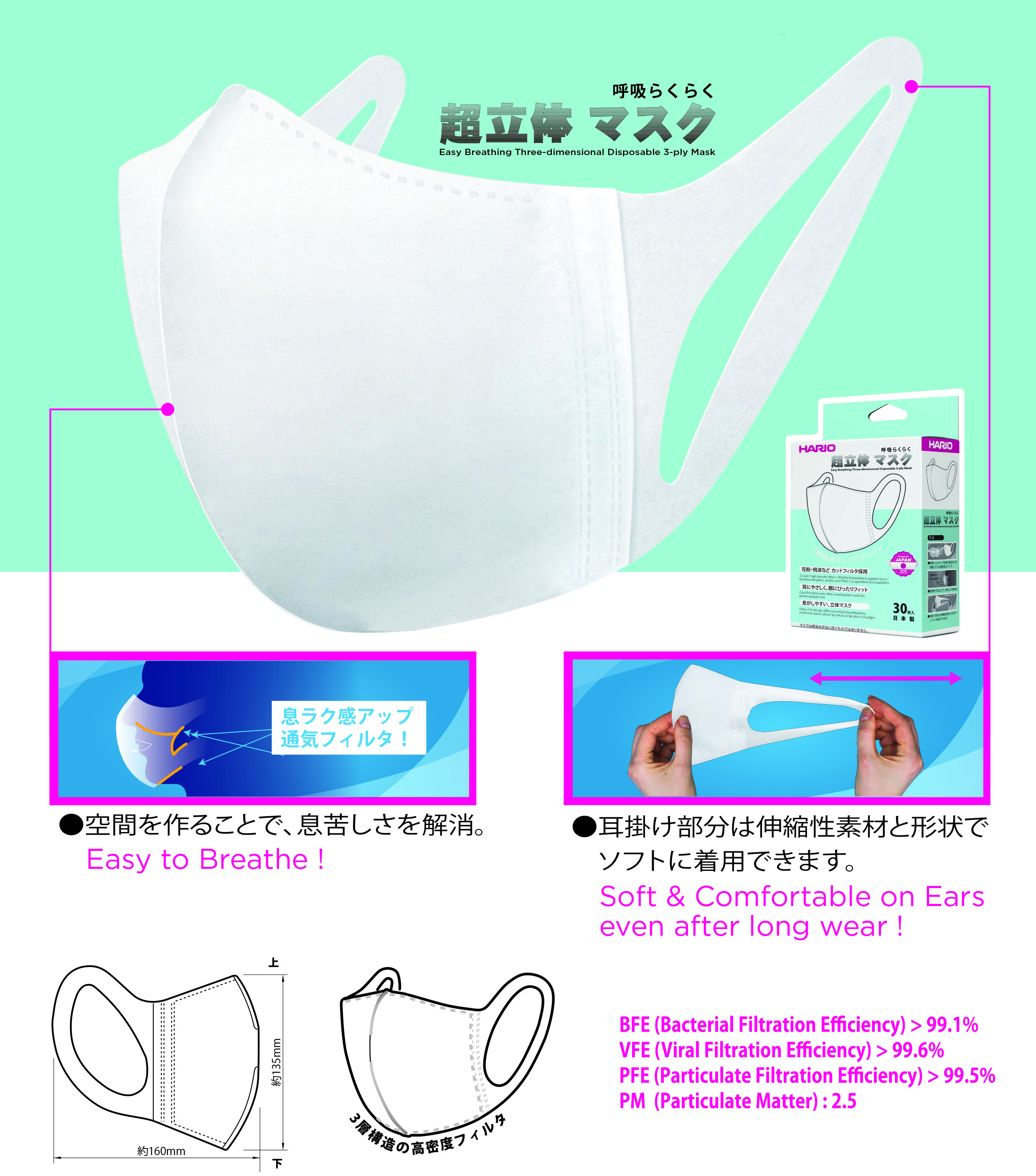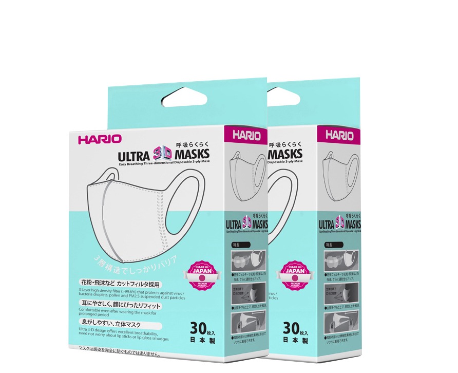 Hario Easy Breathing 3-D Disposable 3-Ply Mask (2 Packs - 60-Piece, Premium Quality) (Made In Japan)