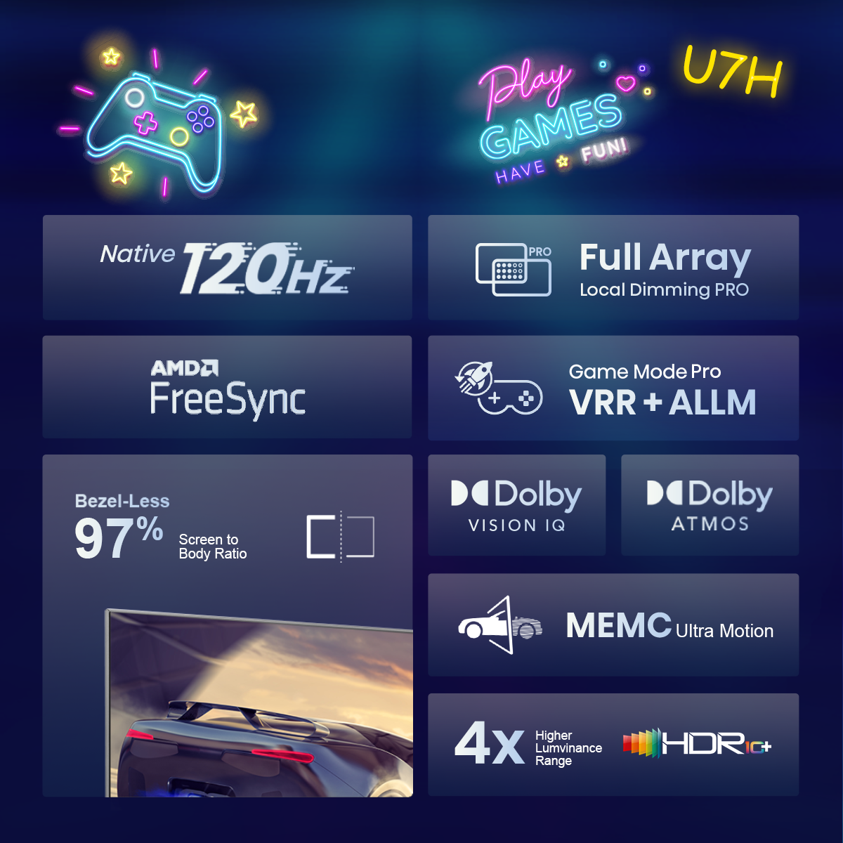 [2022] Hisense U7H 75" 85" QLED+/ULED Native 120Hz | Dolby Vision IQ | Dolby Atmos | HDR 10+ | MEMC VRR ALMM | Full Array Local Dimming PRO | Ultra Motion | Free Sync | Dual Wifi | 4K Smart TV