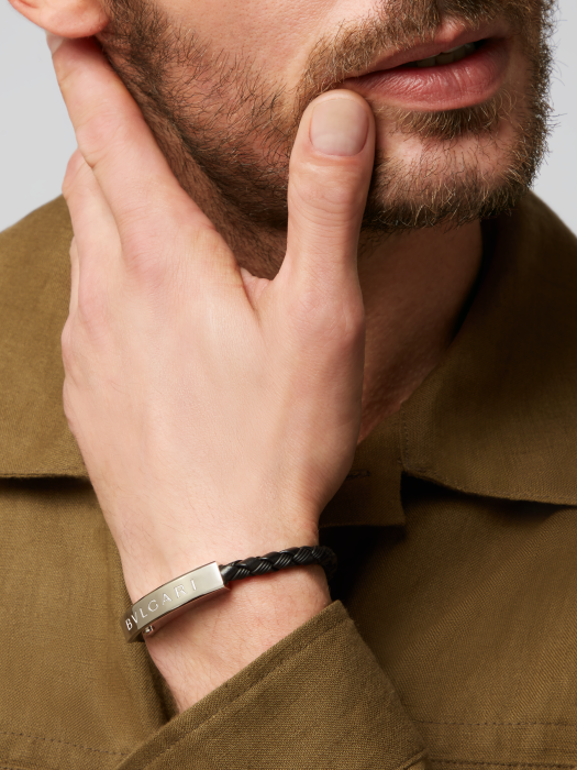 BLACK BRAIDED CALFSKIN AND RUBBER MEN'S BRACELET FROM BULGARI BULGARI COLLECTION. THIS BRACELET FEATURES A SILVER BUCKLE ADORNED WITH THE ICONIC BULGARI LOGO ON THE FRONT, ADDING A UNIQUE TOUCH TO EVERYDAY LOOKS. 18.5 CM - 7.3 INCHES (WRIST CIRCUMFERENCE). MADE IN ITALY.