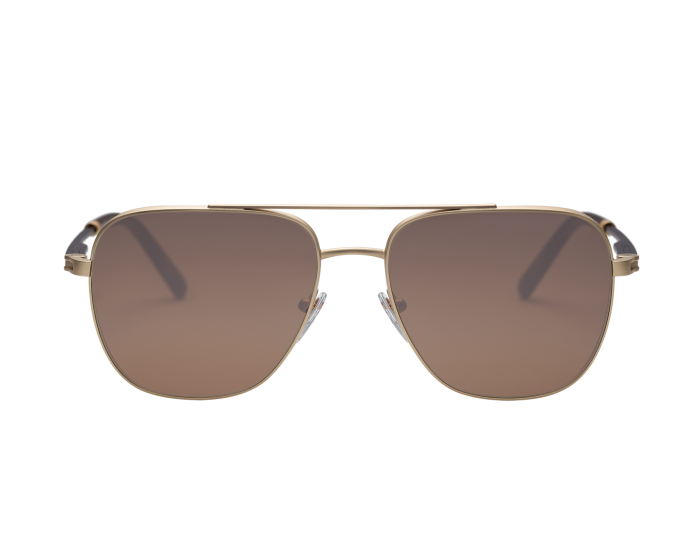 BULGARI BULGARI ALUMINUM SUNGLASSES IN AVIATOR FRAME WITH BROWN LENSES. THESE SUNGLASSES ARE ENGRAVED WITH THE BRAND'S SIGNATURE LOGO AT THE TOP OF THE ALUMINUM TEMPLES.