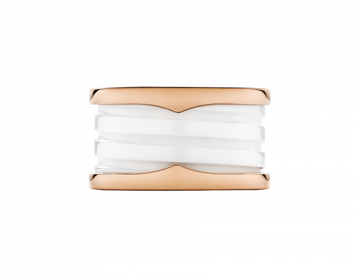 DRAWING INSPIRATION FROM THE WORLD-FAMOUS AMPHITHEATRE, THE COLOSSEUM, THE B.ZERO1 RING TRULY DEMONSTRATES BULGARI'S CREATIVE VISION AND CHALLENGES THE VERY ESSENCE OF JEWELRY DESIGN. ITS UNIQUE AND PURE SPIRAL SHAPE SYMBOLIZES THE HARMONY OF PAST, PRESENT AND FUTURE - WHICH IS REFLECTED IN THE SPLENDOR OF THE ETERNAL CITY - AND THE PIONEERING SPIRIT OF THE COLLECTION. B.ZERO1 FOUR-BAND RING IN 18K ROSE GOLD DECORATED WITH WHITE CERAMIC