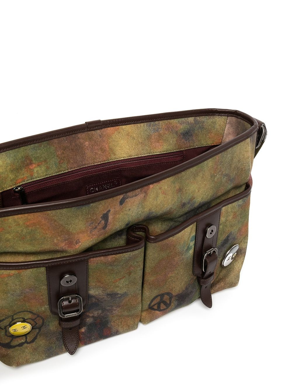 Khaki, multicolor, canvas, iconic clasp CC logo, rough details, graffiti printing, flip with magnetic buckle, two front pockets, decorative buckle, main mezzanine, built-in zipper pocket, adjustable shoulder straps.