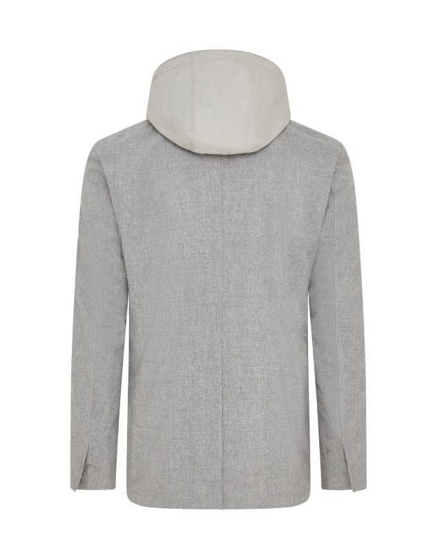 The Corneliani Tech Wool Hooded Blazer in light grey redefines modern tailoring with innovative design. Crafted from advanced tech wool, it offers exceptional breathability and durability. The detachable chest piece adds versatility, allowing you to switch between refined blazer and casual hooded styles effortlessly. This piece combines sophistication with function, perfect for the contemporary gentleman seeking expert craftsmanship and adaptable elegance.