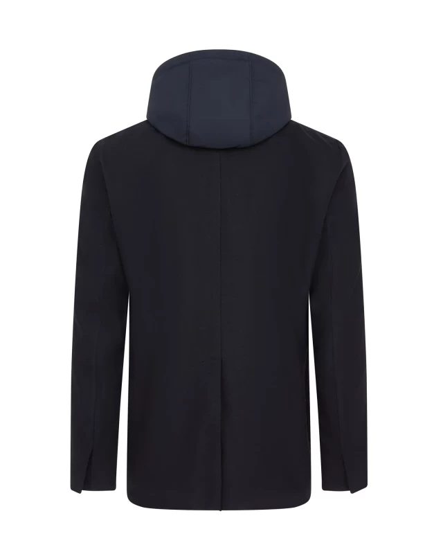 Combining advanced tailoring with innovative materials, the Corneliani Tech Wool Hooded Blazer in navy features a sleek hood and a detachable chest piece for versatile styling. Crafted from tech wool, it offers durability and breathability while maintaining a refined silhouette. Ideal for the modern gentleman, this blazer adapts effortlessly from professional settings to smart casual occasions, providing both comfort and a distinguished appearance.