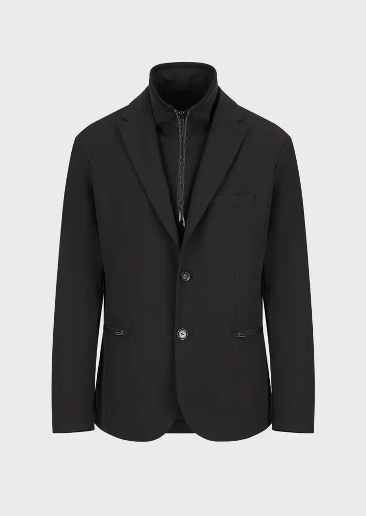 This EMPORIO ARMANI single-breasted blazer is crafted from breezy matte fabric for a comfortable, modern fit with a natural fit. A full-zip, detachable interior panel and heat-sealed zips at the side pockets enhance this piece's performance. Its identity and personality are defined by the concept of travel light, which characterizes most of the garments in this season's travel collection. Innovative cuts and fabrics bring a whole new dimension to dressing: easily paired with a variety of tops and accessories to create functional yet casual clothing for comfortable travel.