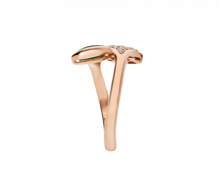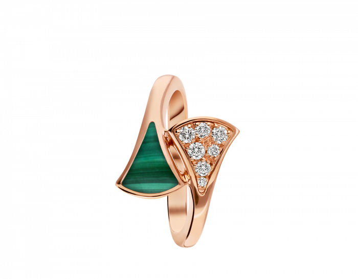 THE DIVAS' DREAM SERIES OF RINGS EMBODIES THE ELEGANT CHARM OF ITALIAN STYLE, RELEASING THE POWER OF WOMEN WITH MYSTERIOUS AND UNFORGETTABLE TEMPERAMENT. THE GLAMOROUS AND EXQUISITE RING IS DECORATED WITH A FAN-SHAPED PATTERN, WHICH DRAWS INSPIRATION FROM THE MOSAIC DECORATION OF THE BATHS OF CARACALLA IN ROME (BATHS OF CARACALLA), AND HIGHLIGHTS THE RELATIONSHIP BETWEEN BVLGARI AND THE "ETERNAL CITY" ROME WITH MODERN FASHION DESIGN AND EXQUISITE GEMSTONE COMBINATION. HISTORICAL ORIGINS. DIVAS' DREAM RING IN 18K ROSE GOLD SET WITH MALACHITE AND PAVÉ DIAMONDS.