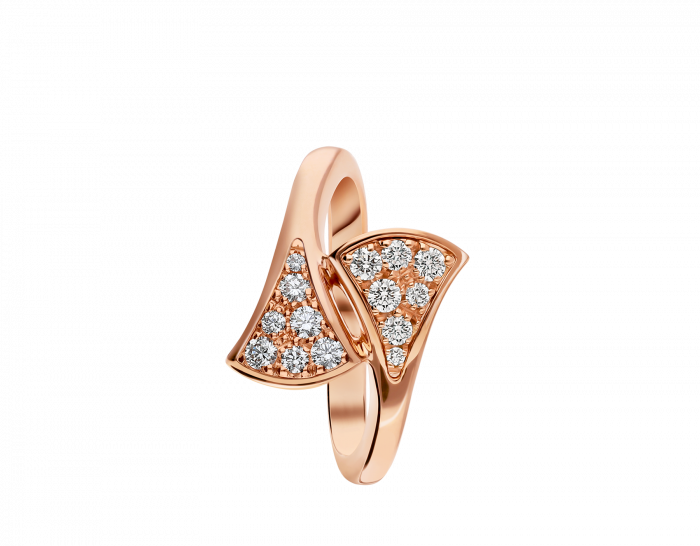 THE DIVAS' DREAM SERIES OF RINGS EMBODIES THE ELEGANT CHARM OF ITALIAN STYLE, RELEASING THE POWER OF WOMEN WITH MYSTERIOUS AND UNFORGETTABLE TEMPERAMENT. THE GLAMOROUS AND EXQUISITE RING IS DECORATED WITH A FAN-SHAPED PATTERN, WHICH DRAWS INSPIRATION FROM THE MOSAIC DECORATION OF THE BATHS OF CARACALLA IN ROME (BATHS OF CARACALLA), AND HIGHLIGHTS THE RELATIONSHIP BETWEEN BVLGARI AND THE "ETERNAL CITY" ROME WITH MODERN FASHION DESIGN AND EXQUISITE GEMSTONE COMBINATION. HISTORICAL ORIGINS. DIVAS' DREAM RING IN 18K ROSE GOLD SET WITH PAVÉ DIAMONDS.