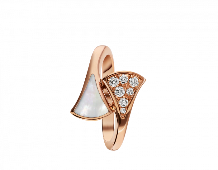 THE DIVAS' DREAM SERIES RINGS DRAW INSPIRATION FROM THE ELEGANCE OF WOMEN AND THE CHARM OF THE ETERNAL CITY, PAYING TRIBUTE TO CHARMING WOMEN WITH A UNIQUE ROMAN SPIRIT. FEMININE AND REFINED, THIS RING EXPRESSES THE RICHNESS OF THE CARACALLA BATHS MARBLE AND THE ALLURING CURVES OF THE SCALLOPED MOSAICS, THE TRUE ESSENCE OF ITALIAN AESTHETICS.