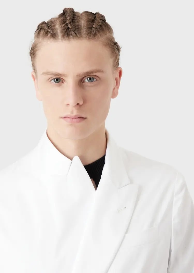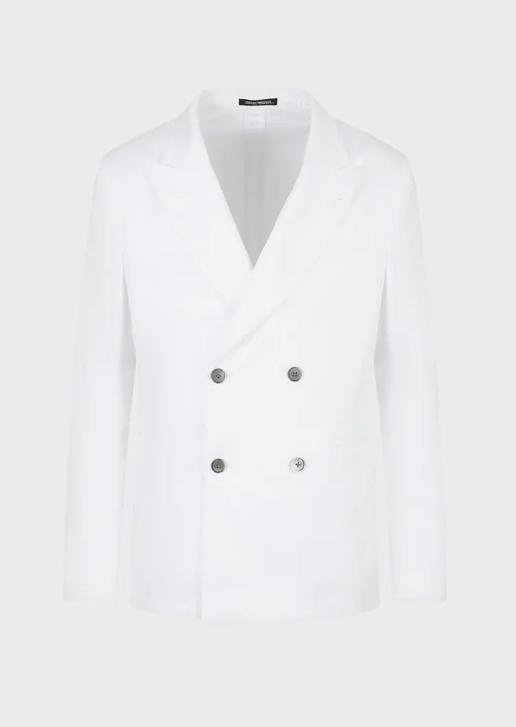 This EMPORIO ARMANI blazer features a lapel collar double-breasted three-dimensional cut, a clear and unlined design, with double welt pockets and rear side slits for flexible and practical wear. The natural luster of the material gives it a fresh feeling, highlighting the urban style, creating a charming summer urban look.