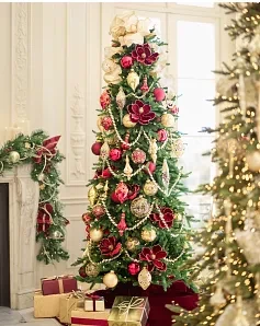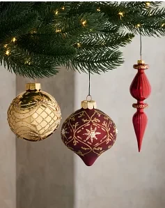 • Features assorted balls, finials, onions, and drop ornaments in burgundy and gold hues, embellished with glitter and beads