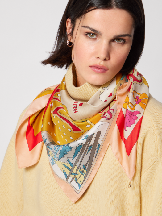 VIAGGIO DI SOTIRIO SERIES SCARVES ARE MADE OF SHELL QUARTZ PINK EXQUISITELY PRINTED TWILL SILK MATERIAL, PAIRED WITH BULGARI BULGARI SERIES METAL PENDANTS, FOLLOWING THE FOOTSTEPS OF BRAND FOUNDER SOTIRIO BULGARI (SOTIRIO BULGARI) TO START A DREAM JOURNEY THROUGH TIME AND SPACE TRIP. FROM GREECE TO ROME, FROM NAPLES TO SANREMO, FROM BELLAGIO TO ST. MORITZ, THESE CREATIVE PATTERNS TRACE HIS PATH TO SUCCESS, ADORNED WITH VINTAGE-INSPIRED POSTCARDS FEATURING BULGARI JEWELERY CREATIONS, AND WITH THE ORIGINAL VERSION OF THE BRAND LOGO. THIS VERSATILE PIECE CAN BE WORN IN DIFFERENT STYLES: TIED AROUND THE NECK FOR A TIMELESS LOOK, TIED AROUND THE WAIST FOR A FEMININE BELT, OR TIED AS A HAIR ACCESSORY FOR A STYLISH LOOK. 90 X 90 CM - 35.4 X 35.4 INCHES. 100% SILK TWILL. HANDMADE IN ITALY