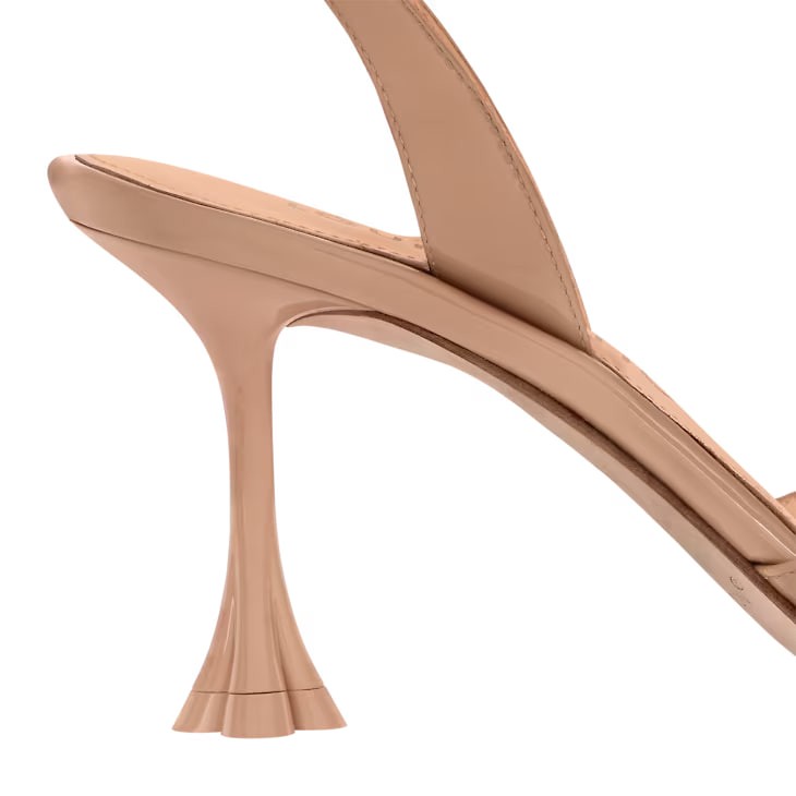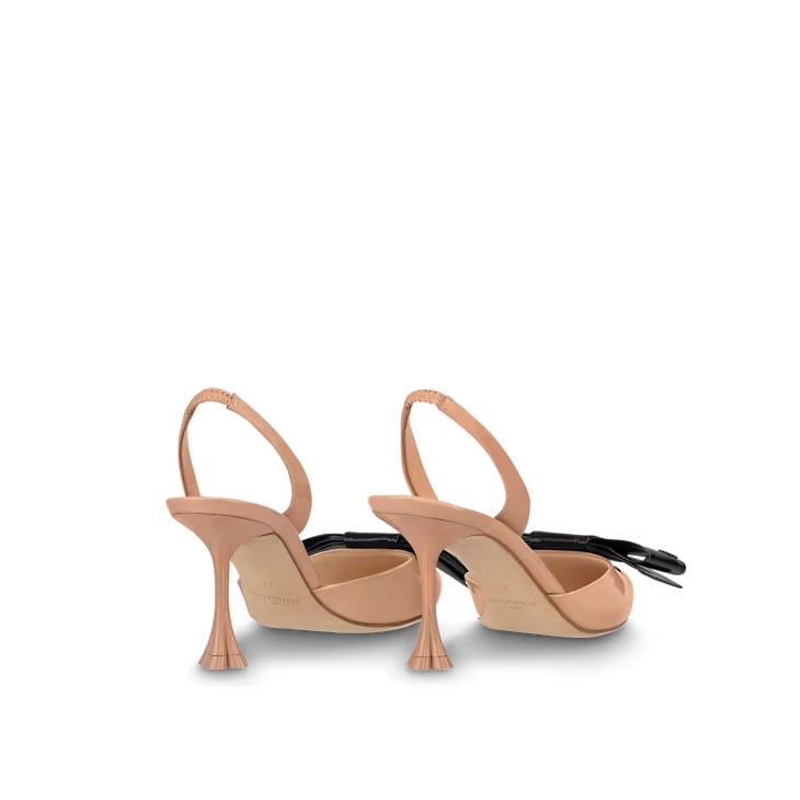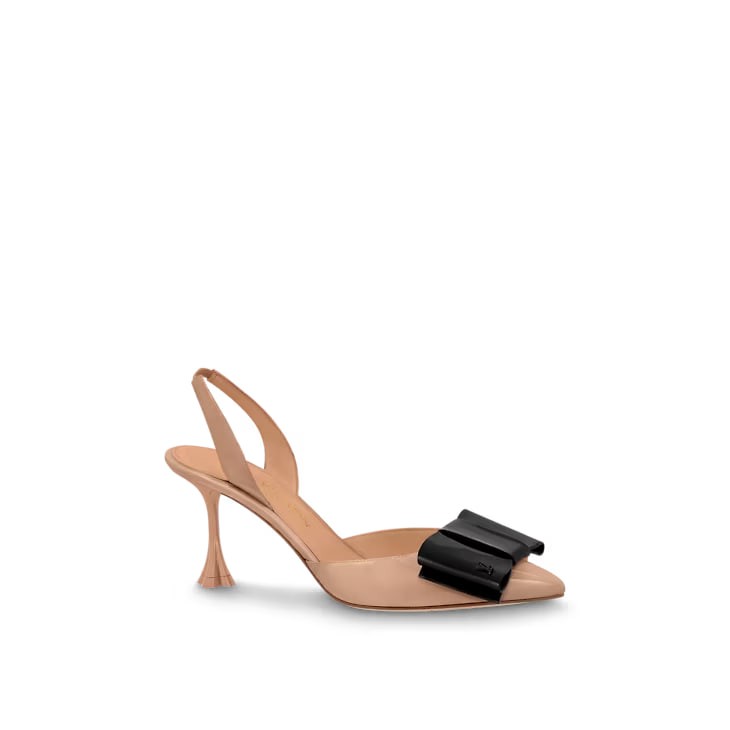 The Blossom slingback pump in patent calf leather is complemented by a contrasting, oversized bow with a tonal LV Initials stud. This elegant model is notable for its high, slender heel in the shape of a round Monogram Flower. A discreet elastic insert on the back strap allows for easy fitting.