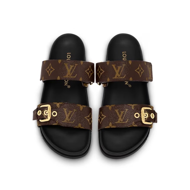 The Bom Dia flat comfort mule combines fashion and function in Louis Vuitton's signature Monogram canvas. This model is notable for its two adjustable straps: one with velcro, the other with an engraved, gold-tone buckle. An anatomic insole and a slip-resistant rubber outsole complete this effortless, on-trend style.