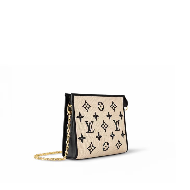 The Toiletry Pouch on Chain is crafted from natural cotton with a black Monogram pattern and coordinating leather trim. This model was inspired by the Poche Toilette cosmetic pouch, created in 1901, which Louis Vuitton clients also used as a clutch. This reworked design has a removable, gold-tone chain for hand or shoulder carry.