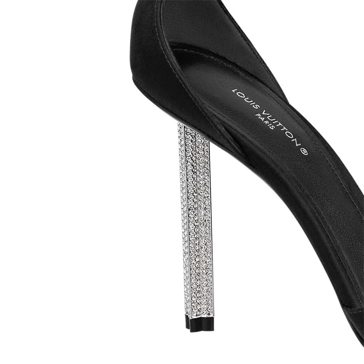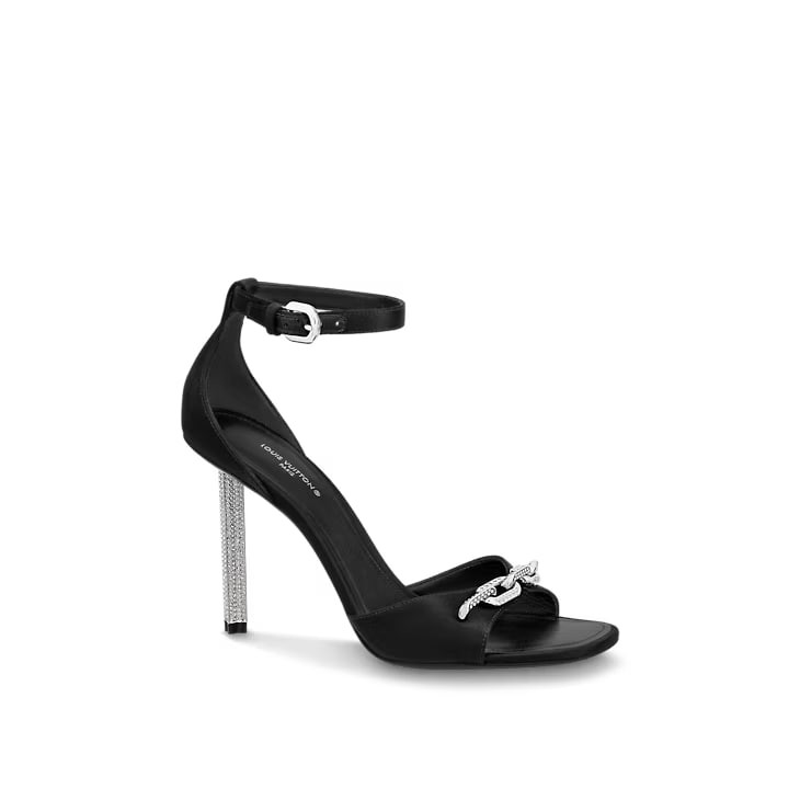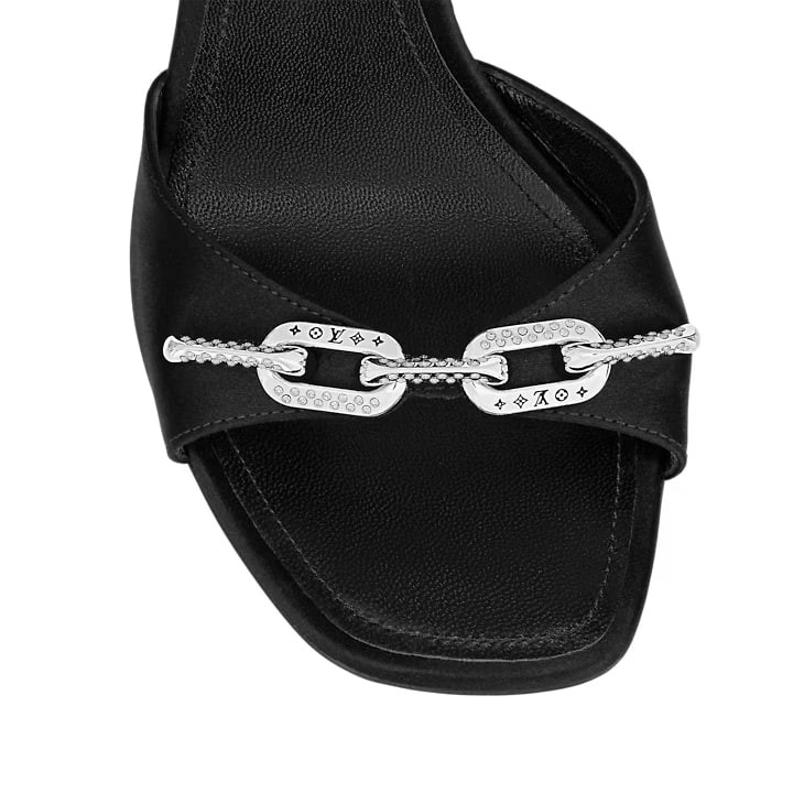 The Diva sandal comes in smooth black satin, which is complemented by the shimmering crystals on its high, Monogram Flower-shaped heel. The sandal's front strap is embellished with a crystal-encrusted chain accessory inspired by the emblematic Coussin bag. A fine leather outsole completes this elegant design.