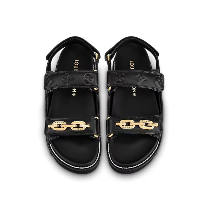 This elevated interpretation of the Paseo flat comfort sandal comes in soft, padded lambskin, which is embossed with the Monogram pattern. The front strap is embellished with a graphic, gold-tone chain inspired by the emblematic Coussin handbag. Other key features of this design are its adjustable velcro straps and ultra-lightweight micro outsole.