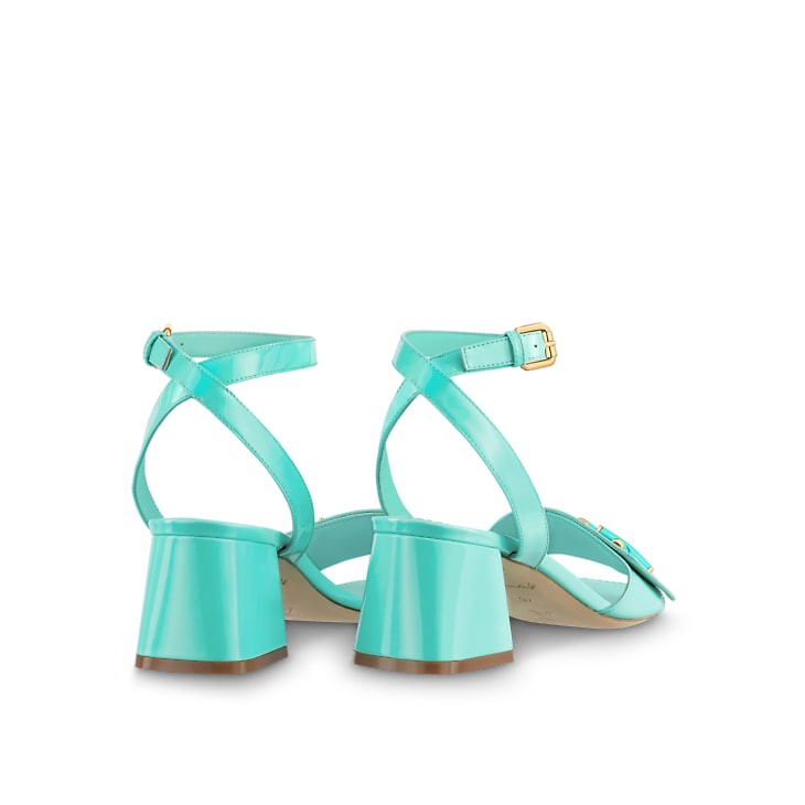 The Shake sandal comes in high-shine patent calf leather, which complements its striking, modern design. Key features are the tonal LV accessory on the front strap, which was inspired by the clasp of the Twist bag, and the graphic, V-shaped block heel. This model is finished with a slender ankle strap and a leather outsole.