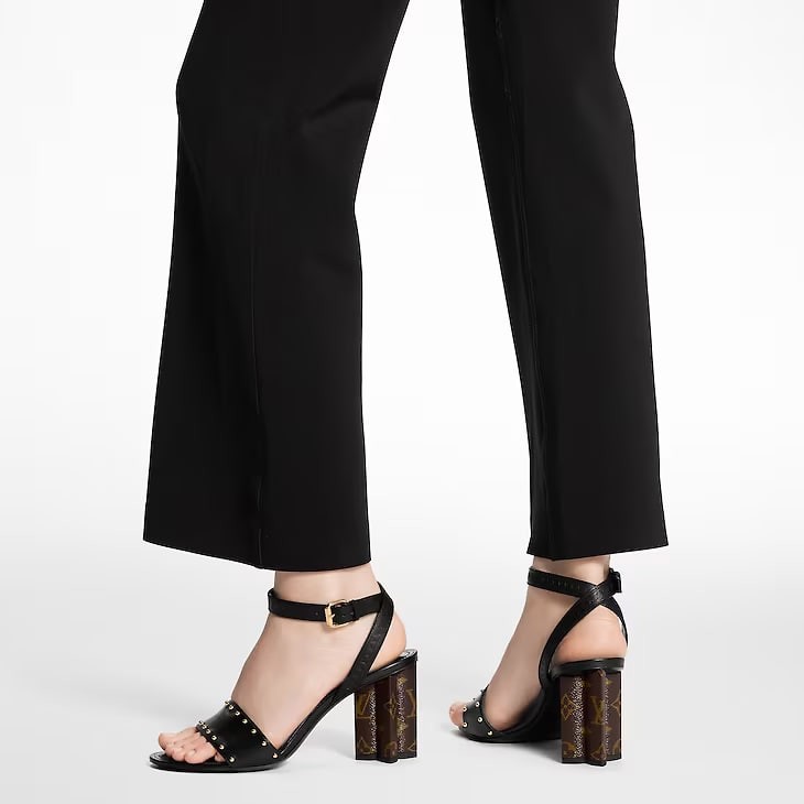 The Silhouette sandal is a refined style combining a calf leather upper with an iconic Monogram Flower-shaped heel covered with patent Monogram canvas. Key details evoke historic Louis Vuitton trunks: the tiny, gold-tone studs decorating the front strap, and the row of LV Initials discreetly embossed on the ankle strap.