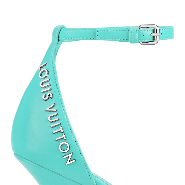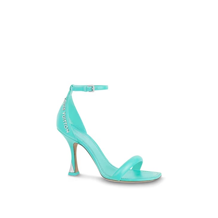 The Sparkle sandal is crafted from supple lambskin. This feminine style is distinguished by its slender front strap and distinctive flared heel, which is embellished with an LV Circle-engraved metal insert. On the side of the sandal, the Louis Vuitton signature is picked out in silver-tone letters.