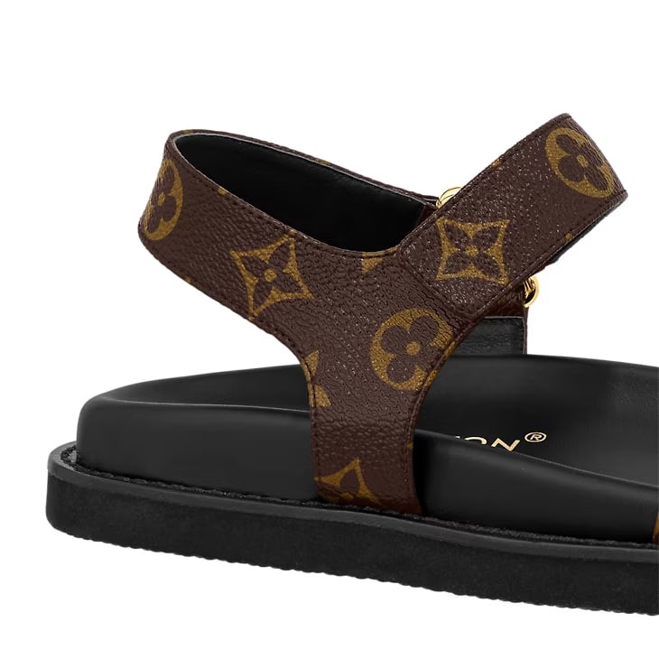 The LV Sunset flat comfort sandal is revisited in Louis Vuitton's signature Monogram canvas. Exceptionally pleasant to wear, this model has two adjustable velcro straps, one of which is embellished with a gold-tone LV accessory inspired by the Twist bag. An anatomic footbed and lightweight micro outsole complete this design.
