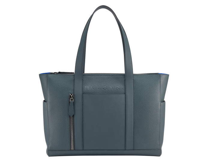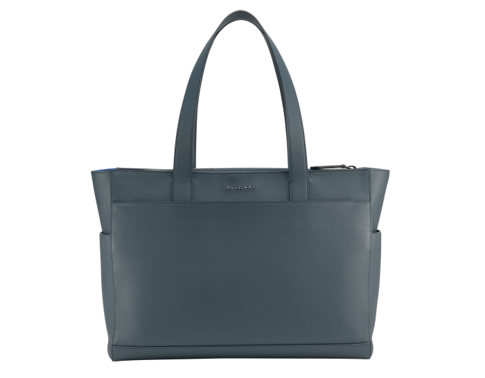 BULGARI HOMME LARGE HORIZONTAL TOTE BAG IN IVY ONYX GRAY SMOOTH AND GRAINED METAL-FREE CALFSKIN WITH OLYMPIC SAPPHIRE BLUE RECYCLED NYLON (ECONYL®) LINING FOR A SUSTAINABLE APPROACH DESIGNED AND CRAFTED, THE TIMELESS SHAPE EXUDES ELEGANCE AND SIMPLICITY. BAG WITH TWO HANDLES, SIGNATURE BULGARI LOGO STAMPED ON THE FRONT, SINGLE COMPARTMENT, ZIP CLOSURE, ONE OPEN FRONT POCKET, ONE ZIPPED FRONT POCKET, ONE BACK PANEL POCKET, TWO SIDE OPEN POCKETS , ONE INTERNAL ZIP POCKET, FOUR OPEN POCKETS, AND BULGARI METAL LOGO ON THE BACK. 40 X 30 X 10 CM - 15.7 X 11.8 X 3.9 INCHES. MADE IN ITALY