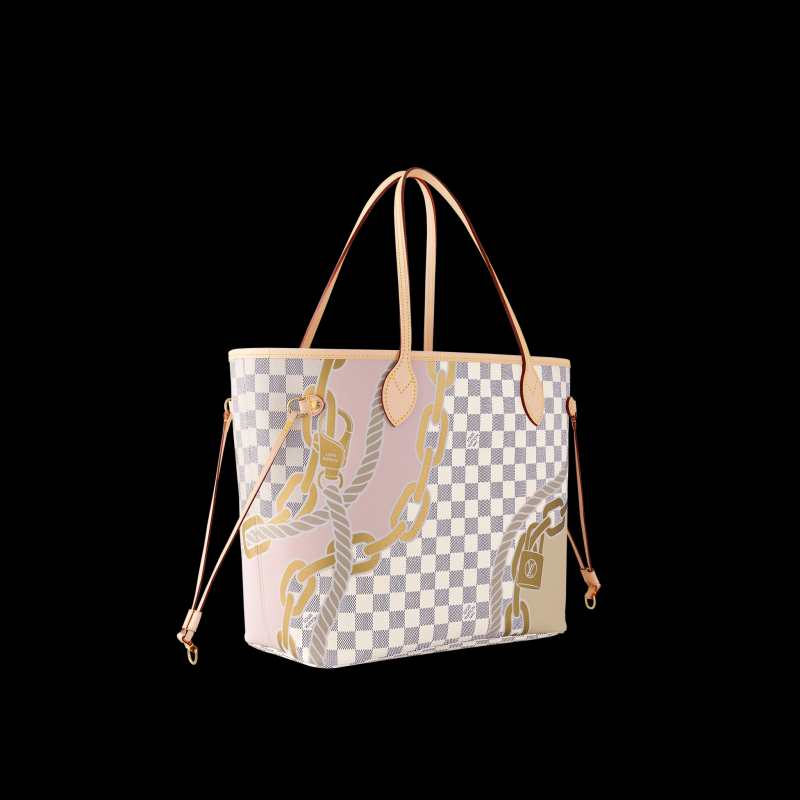 This Neverfull MM tote bag is made from Damier Azur coated canvas customized with a bold five-color nautical print of ropes and chains, bringing a fresh twist to the classic checkerboard pattern. This versatile bag features side laces that can be cinched for a sleeker silhouette or loosened for a more casual look.