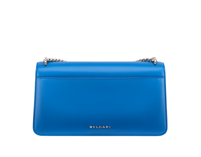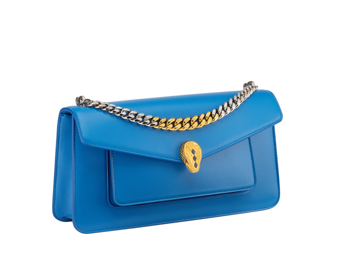 SERPENTI EAST-WEST MAXI CHAIN SERIES MEDIUM-SIZED SHOULDER BAG, MADE OF SOFT AND DURABLE MEDITERRANEAN LAPIS LAZULI BLUE CITY CALFSKIN, PRESENTS A FASHIONABLE AND WIDE SHAPE AND STYLE, FULL OF BOLD AND UNRULY TEMPERAMENT. THIS VERSATILE PIECE IS PERFECT FOR DAY OR NIGHT. THE CHAIN THAT DOUBLES AS A HANDLE IS REMINISCENT OF THE MAISON'S BOLD JEWELLERY, AND IT IS ADORNED WITH A JEWEL-ENCRUSTED SNAKEHEAD MAGNETIC CLASP INSPIRED BY A BULGARI WATCH FROM THE 1960S. FEATURING ONE SINGLE COMPARTMENT WITH LEATHER SHOULDER STRAP, ONE FRONT POCKET, ONE BACK STITCHED POCKET, ONE INNER BONE POCKET, A CUSTOMIZABLE MAKE-UP MIRROR AND BULGARI METAL LOGO ON THE BACK. 28 X 14.5 X 6.5 CM - 11 X 5.7 X 2.5 INCHES. MADE IN ITALY.