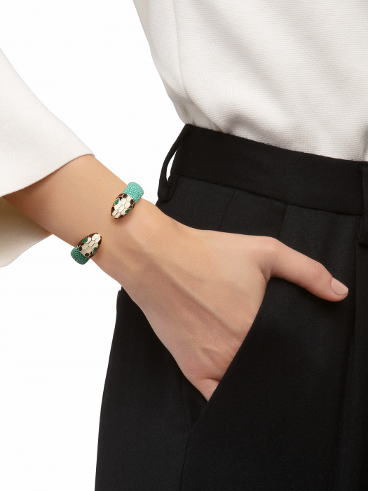 THE SERPENTI FOREVER BANGLE IN BRASS LIGHT GOLD PLATED WITH PRECIOUS EMERALD GREEN PEARL FISH LEATHER COMBINES ATTRACTIVE DESIGN WITH EXQUISITE MATERIALS. ADORNED WITH CAPTIVATING SIGNATURE DOUBLE SNAKE HEADS, THIS BRACELET FEATURES SEDUCTIVE COLORED SCALES AND A DELICATE DESIGN INSPIRED BY THE CLASSIC SERPENTI JEWELERY OF THE 1960S, ADDING A TOUCH OF GLAMOUR TO ANY LOOK, DAY OR NIGHT. 16.5 CM - 6.5 INCHES (WRIST CIRCUMFERENCE). MADE IN ITALY.