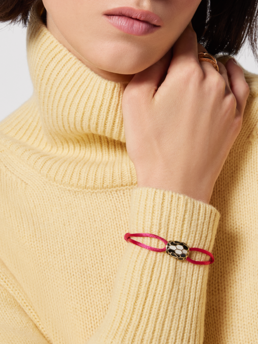 SERPENTI FOREVER FANCY VIVID TOURMALINE BRACELET IN FUCHSIA FABRIC. THIS BRACELET FEATURES A CAPTIVATING SNAKE HEAD ADORNED WITH CAPTIVATING COLORED SCALES AND A DELICATE DESIGN INSPIRED BY THE CLASSIC SERPENTI JEWELRY FROM THE 1960S. ONE SIZE FITS ALL AND FEATURES AN ADJUSTABLE BUCKLE. 14.5CM - 22CM; 5.7" - 8.7" (FOR WRIST SIZE). MADE IN ITALY.