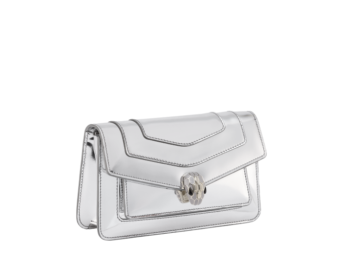 THE SMALL SERPENTI FOREVER EAST-WEST SHOULDER BAG IS MADE OF SILVER MIRRORED CALFSKIN WITH A MODERN REFLECTIVE EFFECT. FITTED WITH A FUNCTIONAL LEATHER SHOULDER STRAP, IT IS FINISHED WITH THE ICONIC SNAKEHEAD MAGNETIC CLOSURE, WHOSE SEDUCTIVE SCALES AND DESIGN ARE INSPIRED BY THE SERPENTI JEWELRY COLLECTION OF THE 1960S, MAKING IT SUITABLE FOR EVERYDAY WEAR. FEATURING ONE SINGLE COMPARTMENT, ONE FRONT POCKET, ONE BACK PANEL POCKET, ONE INTERNAL BONE POCKET, THREE CARD SLOTS, ONE CUSTOMIZABLE VANITY MIRROR AND BULGARI METAL LOGO ON THE BACK. 22 X 13 X 5.5 CM - 8.7 X 5.1 X 0.7 INCHES. MADE IN ITALY.