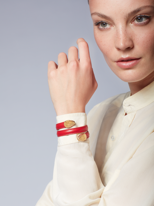 THE SERPENTI FOREVER CLEOPATRA BRACELET, MADE OF SOFT FUCHSIA GARNET RED LAMBSKIN, ELEGANTLY WRAPS AROUND THE WRIST. THIS BRACELET FEATURES A CHARMING GOLD-PLATED BRASS SIGNATURE DOUBLE SNAKE HEAD, ACCENTED WITH CAPTIVATING EYES IN RED ENAMEL. 16.5 CM - 6.5 INCHES (WRIST CIRCUMFERENCE). MADE IN ITALY.