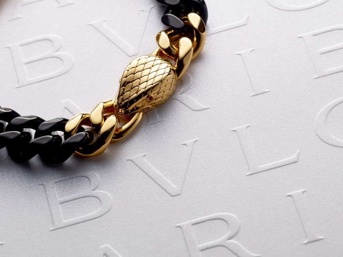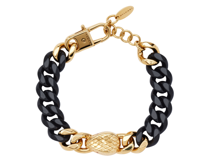 SERPENTI FOREVER MAXI CHAIN BRACELET IN GOLD-PLATED BRASS, PARTLY EMBELLISHED WITH BLACK ENAMEL, COMBINING A THICK "GOURMETTE" (CHAIN-STYLE) CHAIN INSPIRED BY CREATIONS OF HIGH JEWELERY WITH A CHARMING SNAKE DETAIL CHARM. AT THE CENTER OF THE PIECE IS THE CAPTIVATING CLASSIC SNAKE HEAD, A CHARMING INTERPRETATION OF THE COLLECTION'S SIGNATURE DECORATION, INSPIRED BY A BULGARI WATCH FROM THE 1960S. ADJUSTABLE BUCKLE. 15.5 - 17.5 CM; 6.1 - 6.9 INCHES (FOR WRIST). MADE IN ITALY.