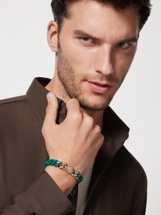 SERPENTI FOREVER MAXI CHAIN BRACELET IN LIGHT GOLD PLATED BRASS PARTIALLY EMBELLISHED WITH EMERALD GREEN ENAMEL, COMBINING A THICK "GOURMETTE" (CHAIN-STYLE) CHAIN INSPIRED BY PIECES OF HIGH JEWELRY WITH A CHARMING SNAKE DETAIL CHARM. AT THE CENTER OF THE PIECE IS THE CAPTIVATING CLASSIC SNAKE HEAD, A CHARMING INTERPRETATION OF THE COLLECTION'S SIGNATURE DECORATION, INSPIRED BY A BULGARI WATCH FROM THE 1960S. ADJUSTABLE BUCKLE. 15.5 - 17.5 CM; 6.1 - 6.9 INCHES (FOR WRIST). MADE IN ITALY.