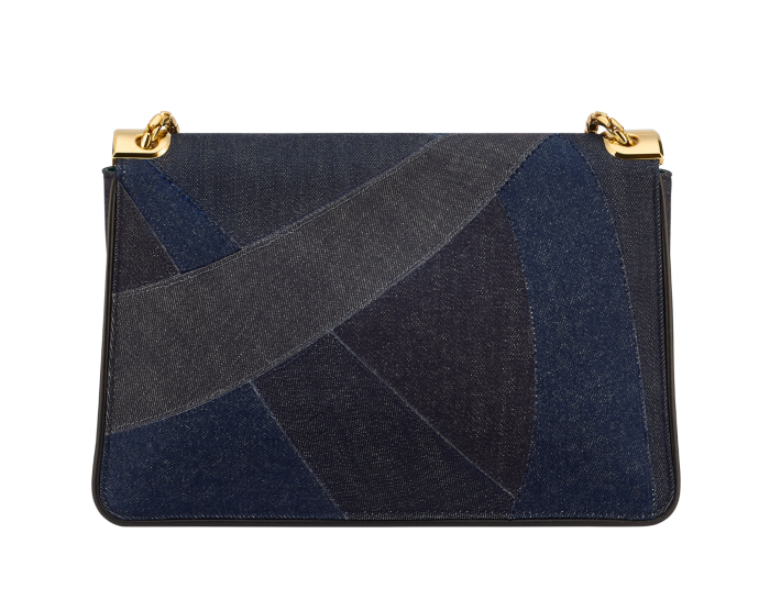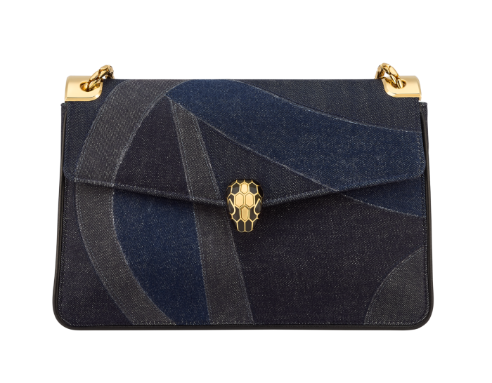 SERPENTI FOREVER LARGE SHOULDER BAG IN BLUE PANELED DENIM, COMBINING FOUR THICK AND HIGH-QUALITY DENIM FABRICS TO FORM AN ABSTRACT PATTERN REMINISCENT OF LIGHT, WITH A GOLD-PLATED BRASS SERPENTINE FRAME INSPIRED BY THE BOLD AND UNRULY SERPENTI OF THE 1960S COLLECTION OF ANTIQUE COLLECTION NECKLACES. THE PIECE IS PAIRED WITH A SNAKE-SHAPED CHAIN SHOULDER STRAP AND DECORATED WITH A CLASSIC SNAKE HEAD MAGNETIC CLOSURE. ITS CHARMING SCALES AND DESIGN ARE INSPIRED BY THE SERPENTI JEWELRY SERIES IN THE 1960S, MAKING IT SUITABLE FOR EVERYDAY WEAR. FEATURES TWO COMPARTMENTS, AN INTERIOR ON-SEAM POCKET AND AN OPEN POCKET. 28.5 X 19 X 7.5 CM - 11.2 X 7.5 X 3 INCHES. MADE IN ITALY.
