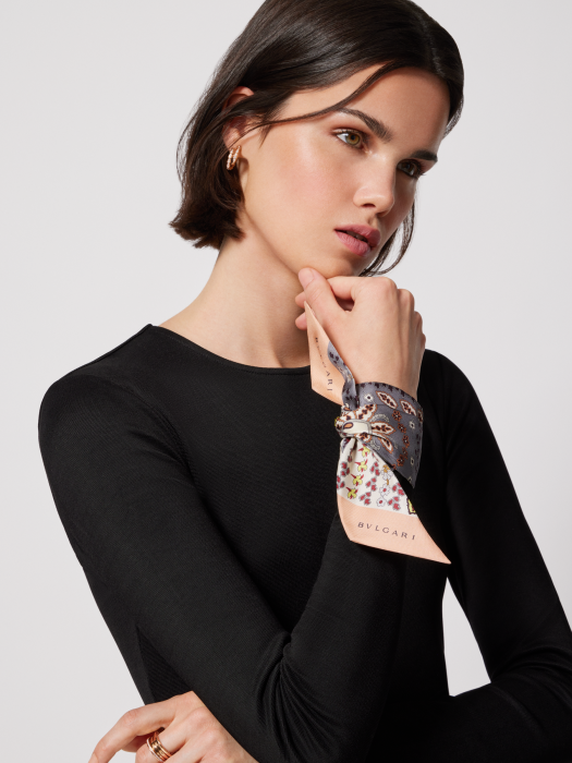THE SERPENTI PAISLEY SERIES MINI SHAWL, MADE OF FINELY PRINTED SILK TWILL WITH GRAY AND WHITE SIDES, SUBTLY INTEGRATES BULGARI'S CLASSIC SYMBOLS INTO A WORLD FULL OF DREAMS AND IMAGINATION. THE DESIGN OF THE WORK IS IMAGINATIVE, AND EVERY ELEMENT IS MAGICALLY TRANSFORMED HERE, SURROUNDING THE CHARMING SNAKE HEAD PATTERN OF THE SERPENTI SERIES, PRESENTING ENDLESS AND CHARMING CREATIVE TRANSFORMATION. COLORFUL FLOWERS AND LEAVES ARE INTERTWINED TO FORM A GEOMETRIC PATTERN, WHICH IS A PLAYFUL INTERPRETATION OF THE FAMOUS PAISLEY PATTERN IN A UNIQUE WAY. THIS PIECE IS EXTREMELY VERSATILE AND VERSATILE: IT CAN BE TIED AROUND THE NECK OR WRIST, WORN AS A HAIR ACCESSORY, OR ADORNED WITH A BAG OR HAT. 5 X 85 CM - 2 X 33.5 IN. 100% SILK TWILL. HANDMADE IN ITALY.