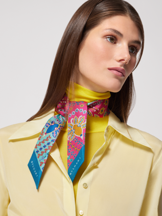 THE SERPENTI PAISLEY SERIES MINI SHAWL, MADE OF EXQUISITELY PRINTED TWILL SILK MATERIAL, WITH PURE TOURMALINE ROSE RED AND LIGHT BLUE ON BOTH SIDES, SUBTLY INTEGRATING BULGARI'S CLASSIC SYMBOLS INTO A WORLD FULL OF DREAMS AND IMAGINATION. THE DESIGN OF THE WORK IS IMAGINATIVE, AND EVERY ELEMENT IS MAGICALLY TRANSFORMED HERE, SURROUNDING THE CHARMING SNAKE HEAD PATTERN OF THE SERPENTI SERIES, PRESENTING ENDLESS AND CHARMING CREATIVE TRANSFORMATION. COLORFUL FLOWERS AND LEAVES ARE INTERTWINED TO FORM A GEOMETRIC PATTERN, WHICH IS A PLAYFUL INTERPRETATION OF THE FAMOUS PAISLEY PATTERN IN A UNIQUE WAY. THIS PIECE IS EXTREMELY VERSATILE AND VERSATILE: IT CAN BE TIED AROUND THE NECK OR WRIST, WORN AS A HAIR ACCESSORY, OR ADORNED WITH A BAG OR HAT. 5 X 85 CM - 2 X 33.5 IN. 100% SILK TWILL. HANDMADE IN ITALY