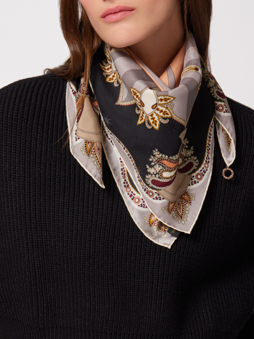 SERPENTI PAISLEY SERIES SCARVES, MADE OF BLACK FINELY PRINTED SILK MATERIAL, PAIRED WITH BULGARI BULGARI SERIES METAL PENDANTS, SUBTLY INTEGRATE BULGARI'S CLASSIC SYMBOLS INTO A WORLD FULL OF DREAMS AND IMAGINATION. EACH ELEMENT UNFOLDS A MAGICAL TRANSFORMATION, SURROUNDED BY BULGARI'S CLASSIC OCTAGONAL PATTERN IN THE CENTER, DESIGNED IN A GEOMETRIC STYLE, SHOWING ENDLESS AND FASCINATING CREATIVE METAMORPHOSIS, REMINISCENT OF THE CONTINUOUS EVOLUTION OF PAISLEY AND GEOMETRIC PATTERNS. THIS VERSATILE PIECE CAN BE STYLED IN DIFFERENT STYLES: TIED AROUND THE NECK FOR A TIMELESS LOOK; TIED AROUND THE WAIST FOR A FEMININE BELT; TIED AS A HAIR ACCESSORY FOR A STYLISH LOOK; OR ADORNED WITH A HANDBAG FOR A PERSONALIZED LOOK. 70 X 70 CM - 27.6 X 27.6 INCHES. 100% SILK. HANDMADE IN ITALY