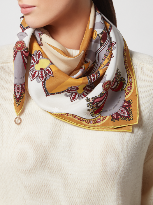 THE SERPENTI PAISLEY SCARF, MADE OF FINELY PRINTED SILK IN WHITE AGATE COLOR, PAIRED WITH BULGARI BULGARI METAL PENDANTS, SUBTLY INTEGRATES BULGARI'S CLASSIC SYMBOLS INTO A WORLD FULL OF DREAMS AND IMAGINATION. EACH ELEMENT UNFOLDS A MAGICAL TRANSFORMATION, SURROUNDED BY BULGARI'S CLASSIC OCTAGONAL PATTERN IN THE CENTER, DESIGNED IN A GEOMETRIC STYLE, SHOWING ENDLESS AND FASCINATING CREATIVE METAMORPHOSIS, REMINISCENT OF THE CONTINUOUS EVOLUTION OF PAISLEY AND GEOMETRIC PATTERNS. THIS VERSATILE PIECE CAN BE STYLED IN DIFFERENT STYLES: TIED AROUND THE NECK FOR A TIMELESS LOOK; TIED AROUND THE WAIST FOR A FEMININE BELT; TIED AS A HAIR ACCESSORY FOR A STYLISH LOOK; OR ADORNED WITH A HANDBAG FOR A PERSONALIZED LOOK. 70 X 70 CM - 27.6 X 27.6 INCHES. 100% SILK. HANDMADE IN ITALY